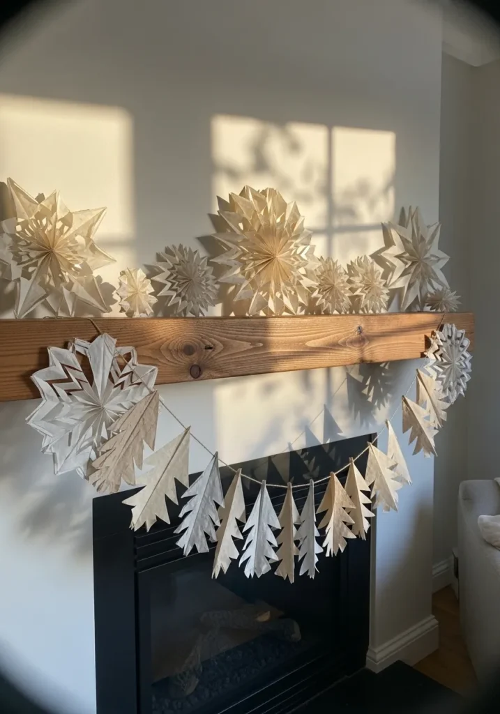 This mantle glows with soft afternoon light, highlighting a row of handmade paper stars in warm beige tones. Each star is delicately folded, creating a play of light and shadow that adds gentle depth to the room. Below, a garland of paper tree cutouts adds a cozy forest touch that ties the whole look together.