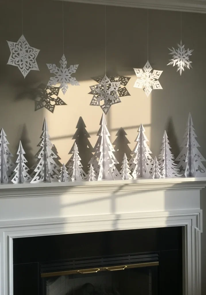 This charming display turns the mantle into a miniature Christmas village made entirely from white paper cutouts. Each tiny house and pine tree catches the soft daylight, while twinkling fairy lights add a subtle sparkle that makes everything look magical.