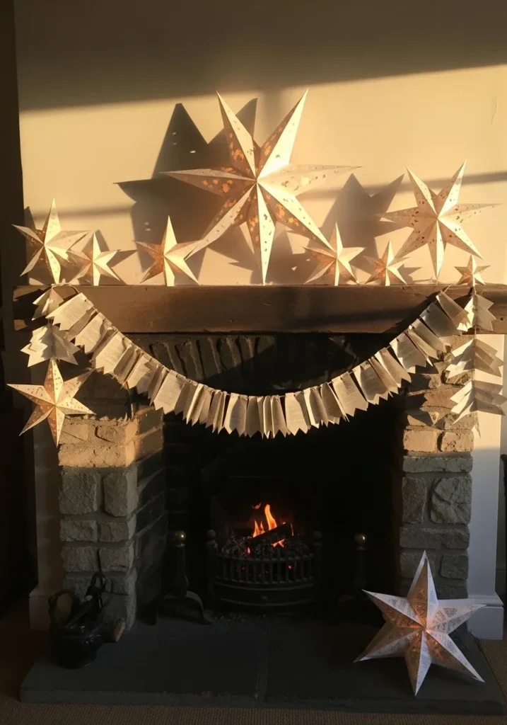 This design feels straight out of a cozy cottage. Golden paper stars in different sizes shimmer above a garland made from folded book pages. The golden light from the nearby fire gives everything a vintage, storybook charm.