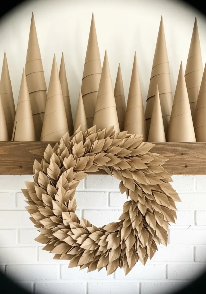 This mantle brings a touch of Scandinavian simplicity with cone-shaped paper trees and a matching wreath made from layered paper leaves. The neutral kraft color ties everything together beautifully while adding warmth to the crisp white backdrop.