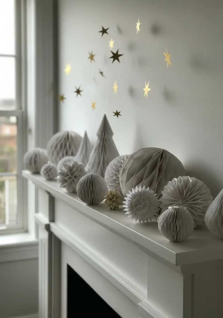 Softly folded paper ornaments and trees fill this mantle with volume and texture, while gold paper stars dance across the wall above. The mix of honeycomb shapes and star details gives it a whimsical, modern charm.