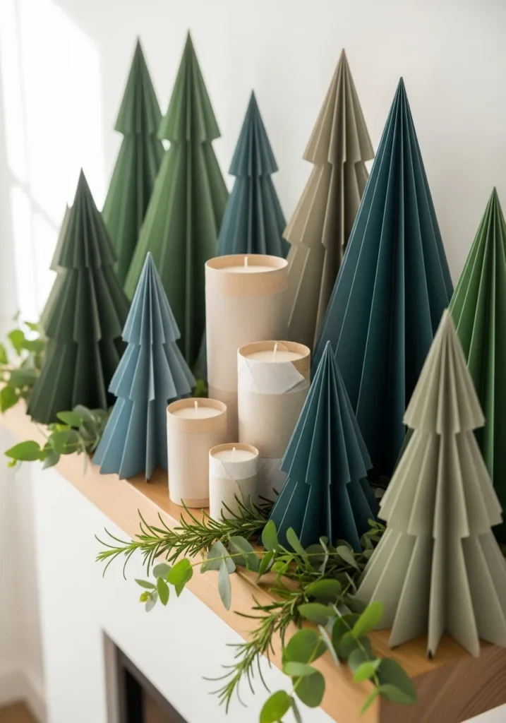 This mantle bursts with paper trees in deep greens and muted blues, paired with candles wrapped in soft neutral paper. The small touches of fresh greenery tucked between them make everything feel alive and natural.