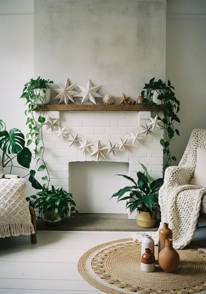 This space feels calm and inviting with a row of handmade paper stars resting on a wooden mantle and a garland of stars hanging below. The potted greenery brings a fresh, organic contrast to the soft neutral tones.