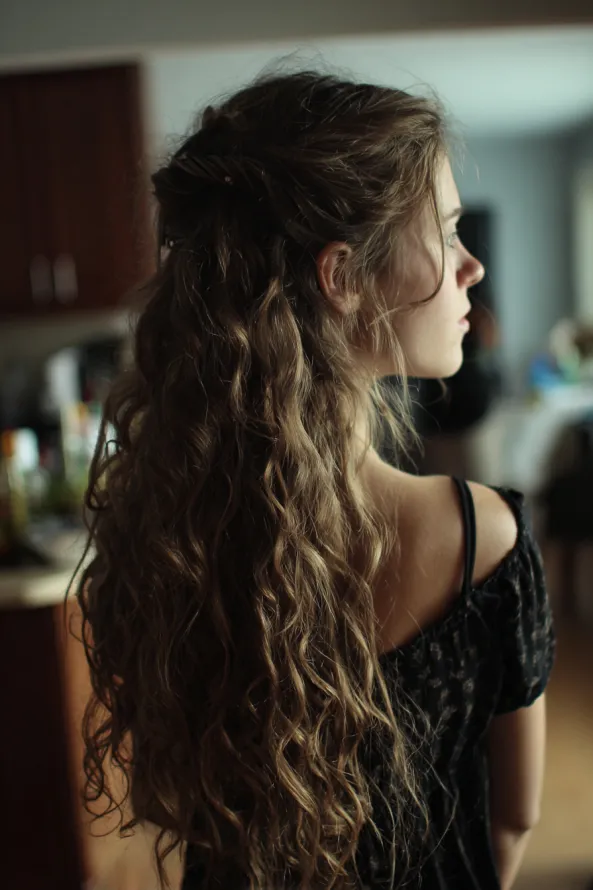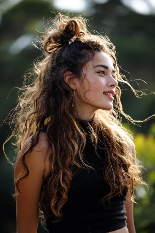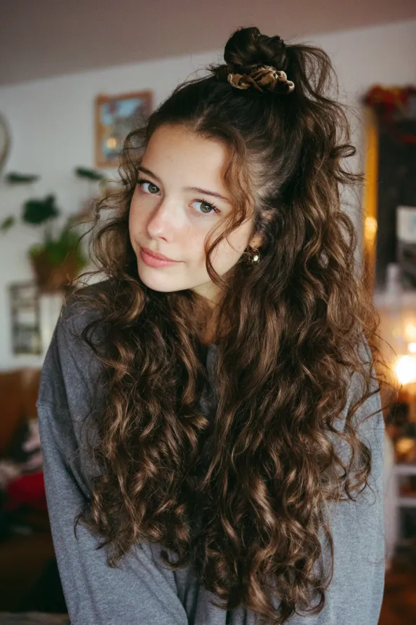 Long curly hair looks its best when the layers support the shape. If your layers are soft and blended, styles like half up looks and loose buns will sit better and feel more balanced.
