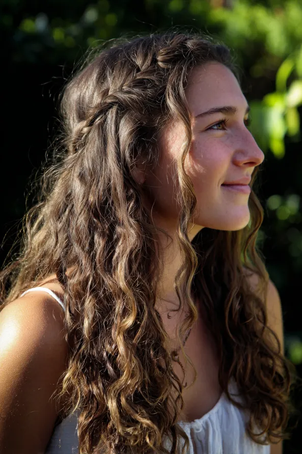 This look combines long curly hair with small braids woven near the crown, blending into loose spirals through the lengths. The curls are defined but soft, creating a romantic and slightly boho vibe.