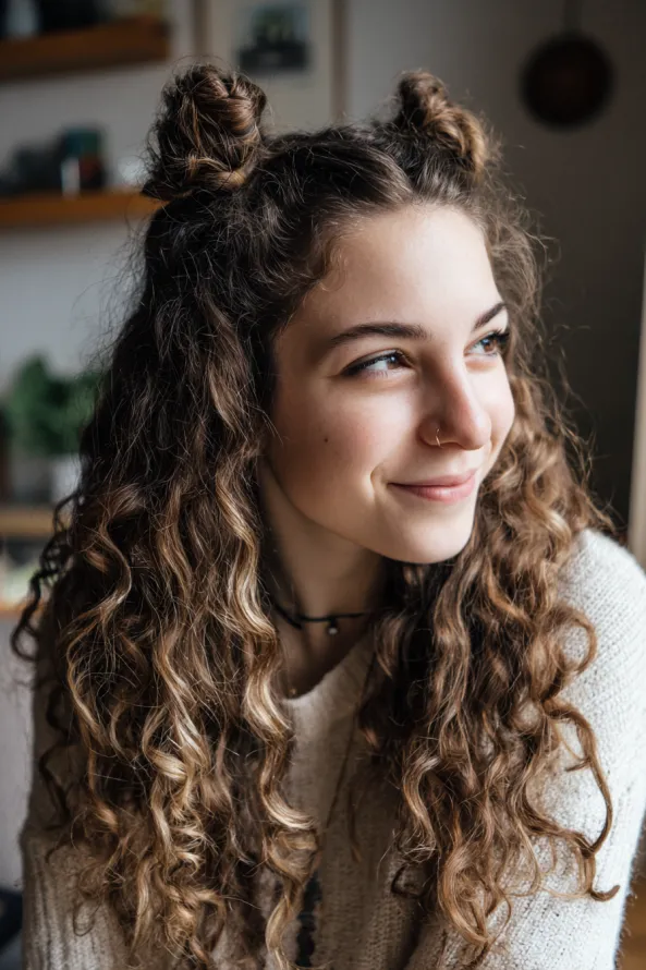 This playful style features long curly hair with two small space buns on top and the rest left loose. The curls are defined and bouncy, creating a fun mix of structure and movement.
