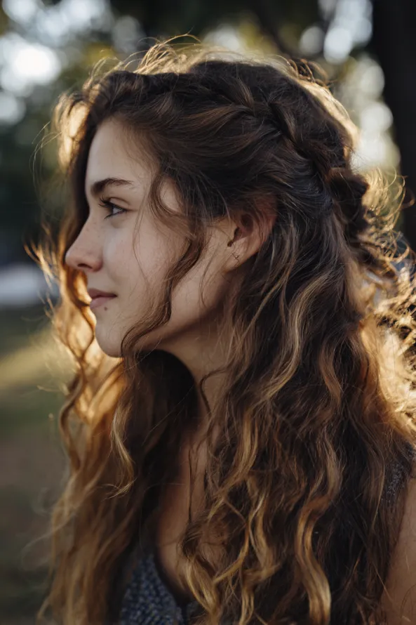 This long curly hairstyle features soft natural waves paired with a delicate side braid that blends into the rest of the hair. The warm light brown tone adds dimension, while the loose texture keeps everything relaxed and touchable.