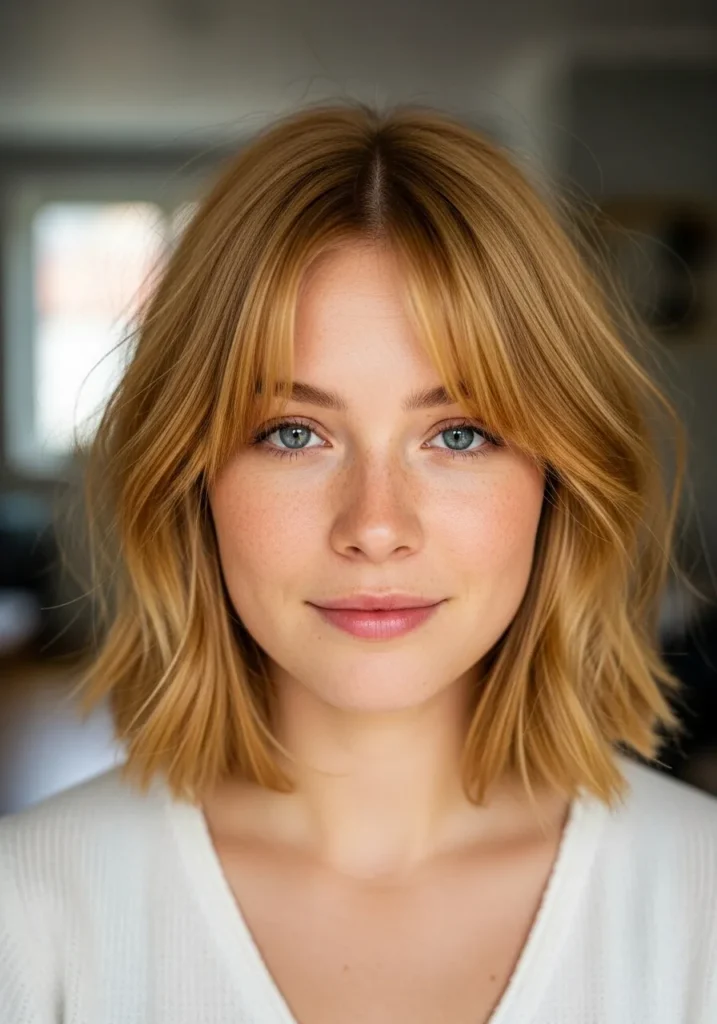 Tousled Strawberry Blonde Bob With Soft Curtain Parting