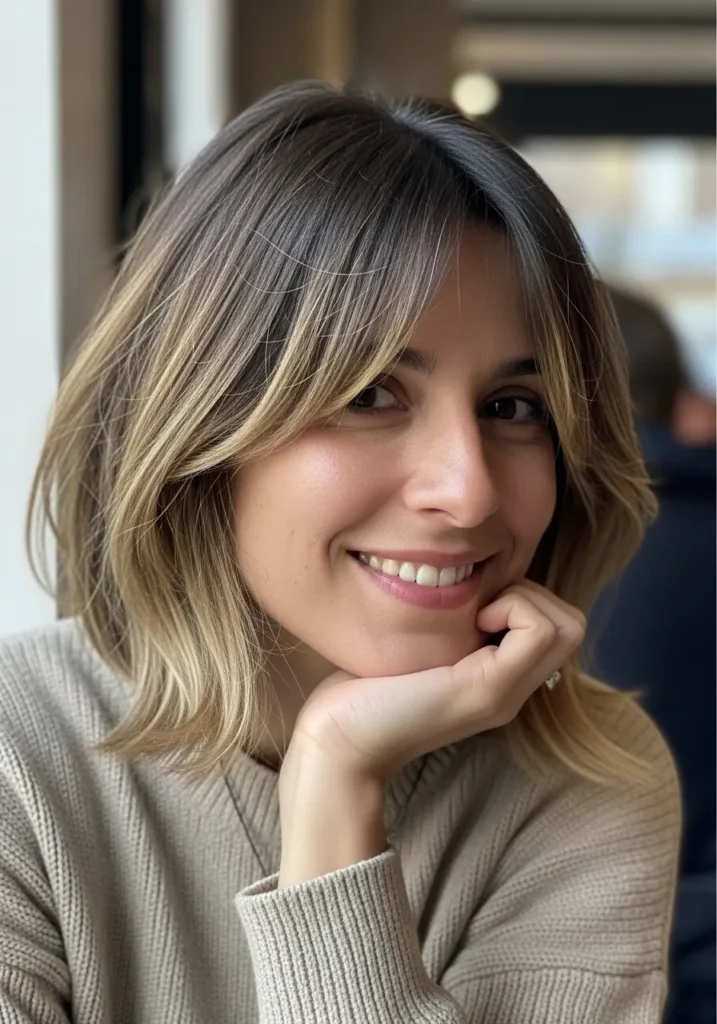 This bob has a soft balayage blend that moves from darker roots into creamy blonde ends. The curtain bangs open gently at the center and blend into feathered layers that give the cut a relaxed shape. Everything feels natural and lightly textured.