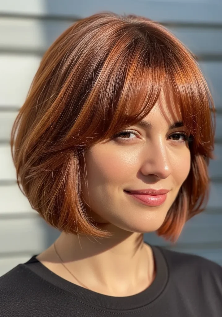 This short bob sits at the chin with warm copper tones that glow softly in the light. The curtain bangs are wispy and fall across the forehead in soft pieces. The ends have a touch of natural movement that keeps the look bright and lively.
