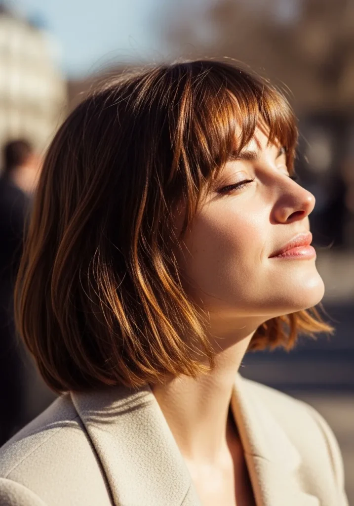 This short bob has a smooth chestnut tone with soft highlights that glow in the sun. The curtain bangs are wispy and light, blending seamlessly into gentle layers that frame the cheeks. The cut feels polished while still keeping a playful texture near the ends.