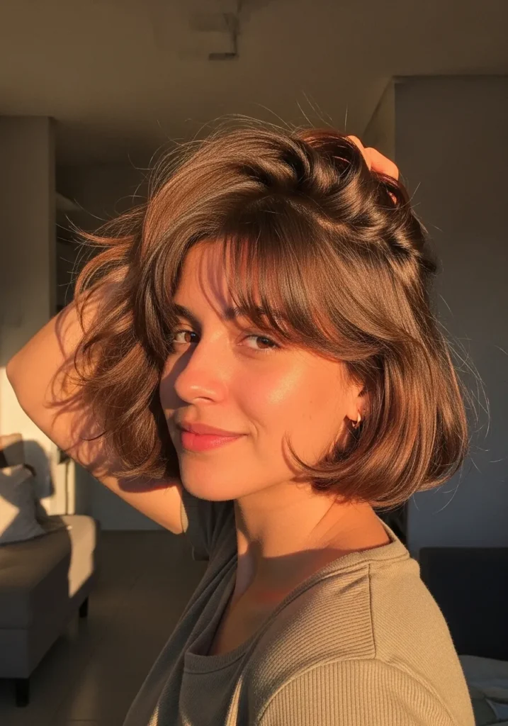 This bob has a sweet wavy texture that hits just above the shoulders, giving the soft brown shade a warm glow. The curtain bangs fall in airy little pieces that blend perfectly into the tousled sides. The whole look feels fresh and light with a sunny lift toward the ends.