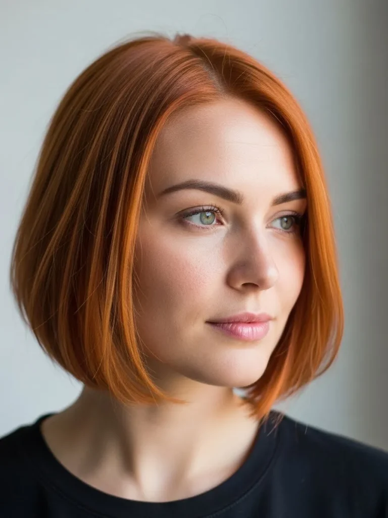 This look features a chin skimming bob with a smooth glossy copper finish that shines beautifully in natural light. The texture is sleek and straight with gently curved ends that frame the face in a clean modern way. The layers are subtle yet precise which helps the copper shimmer look even more refined.