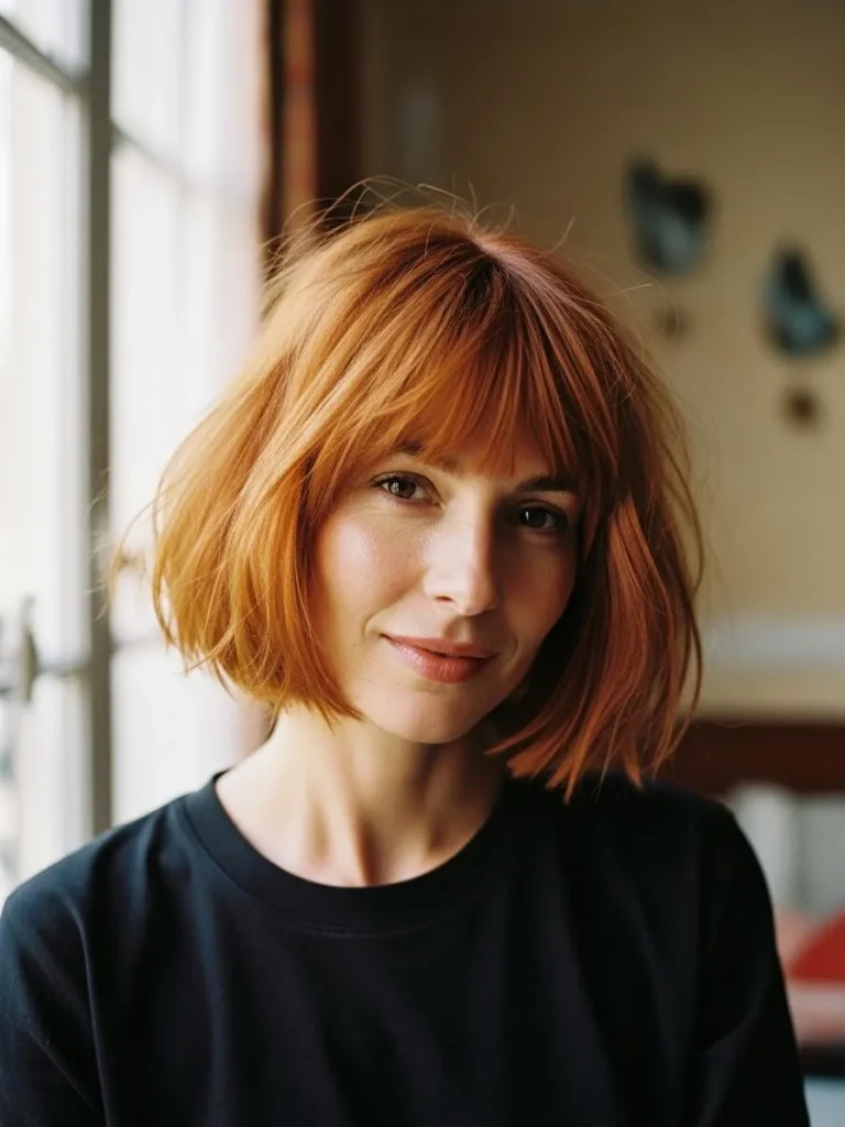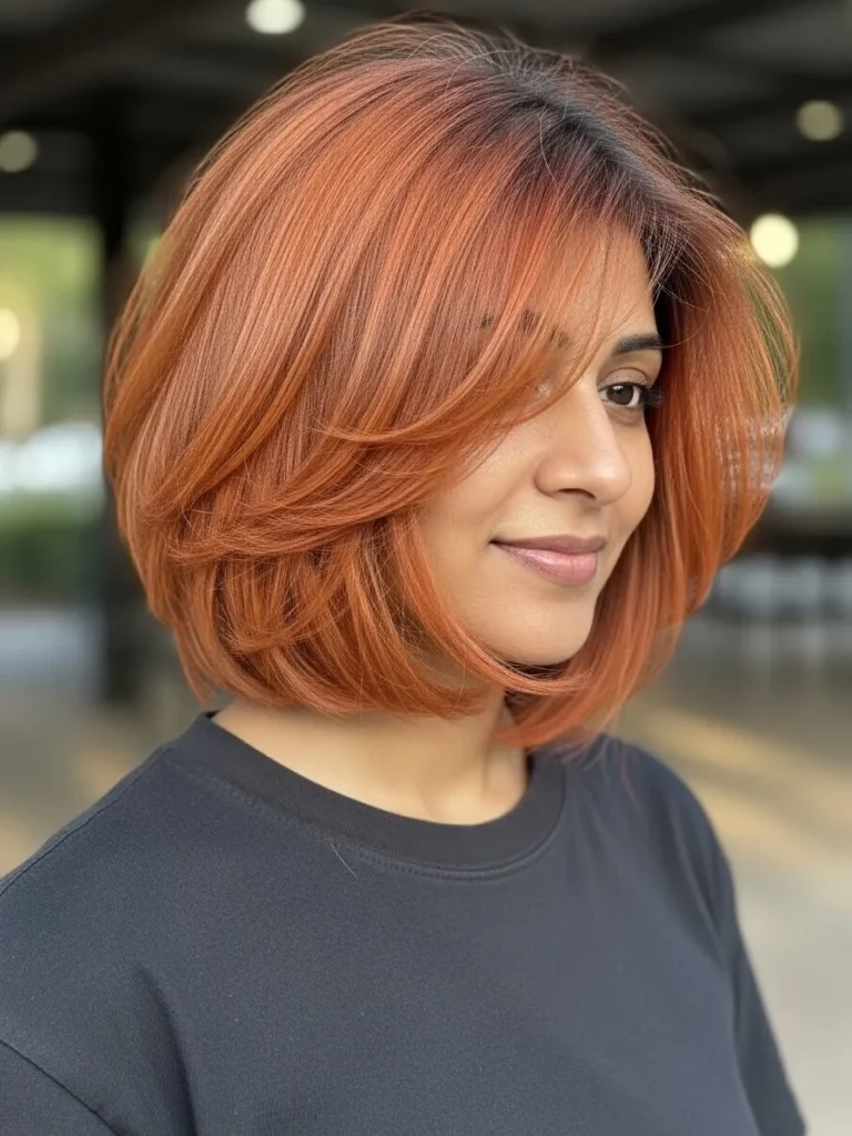 I love how lightweight this bob feels. The side fringe adds the cutest bit of softness and the copper shimmer makes the whole cut glow. It is one of those styles that always makes me feel fresh and relaxed.
