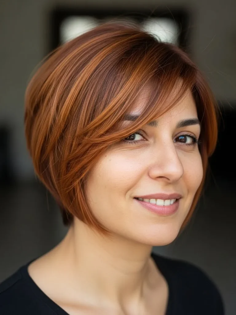 This polished bob has softly curved layers that create a round airy shape. The copper tone is rich and bright and the side fringe adds a sweet modern touch. The ends are clean but still have a gentle choppy finish which keeps the style from looking too stiff.