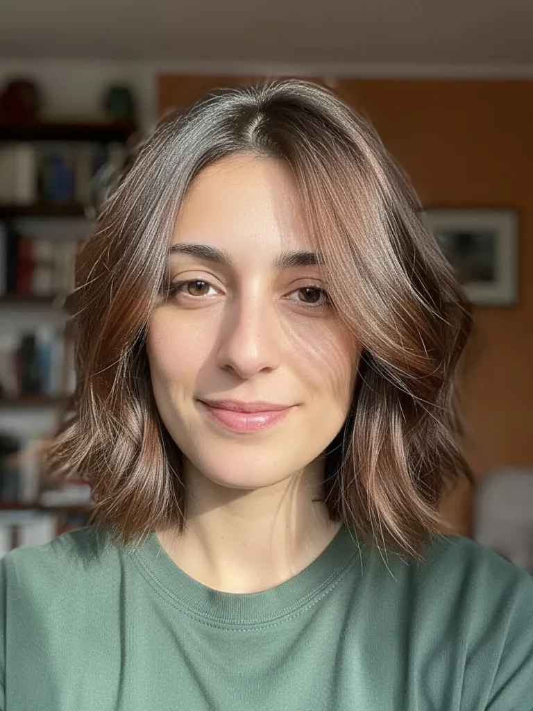 This shoulder length choppy bob has soft airy waves that move naturally. The color leans toward a muted copper brown which gives it a warm understated glow. The layers are loose and subtle and the face framing pieces blend beautifully into the rest of the cut creating a very natural flow.
