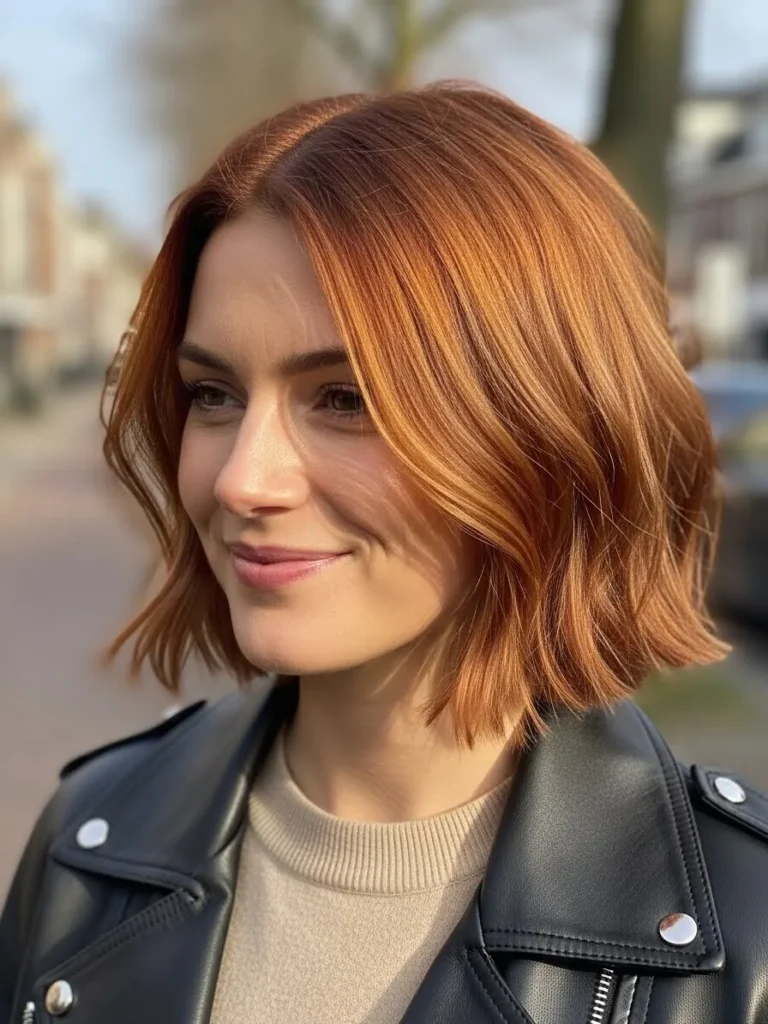 This bob has loose natural waves that create a soft lived in texture. The copper shade warms up beautifully under sunset lighting and gives the style a glowing shimmer. The length sits right above the shoulders which adds bounce and keeps the look light and charming.