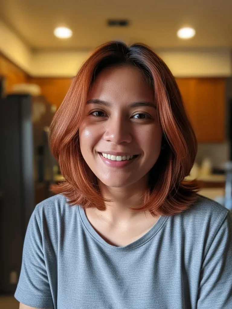 I love how calm and balanced this bob feels. The smooth finish makes it look so put together but the copper shimmer keeps it fun. It is the kind of style I reach for when I want something easy that still brightens my whole look.