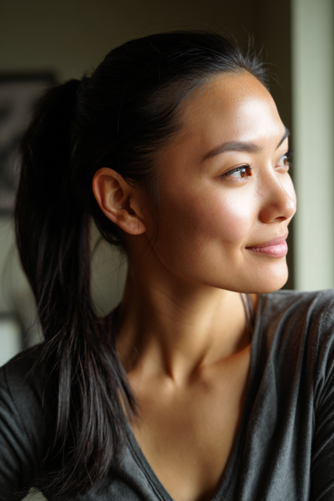 This style blends the best of both worlds by keeping some hair down while pulling the top into a smooth pony. It feels soft but still polished enough for everyday wear.