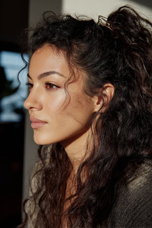 This hairstyle shows long, dark curly hair styled into a half up section secured with a simple clip at the crown. The curls are defined yet soft, with a natural shape and a few loose strands framing the face.