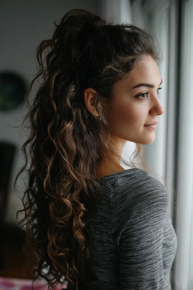 Here we have long, layered curly hair gathered into a half up ponytail that adds lift at the crown. The curls fall in soft spirals with a natural bounce, creating a full and voluminous silhouette.