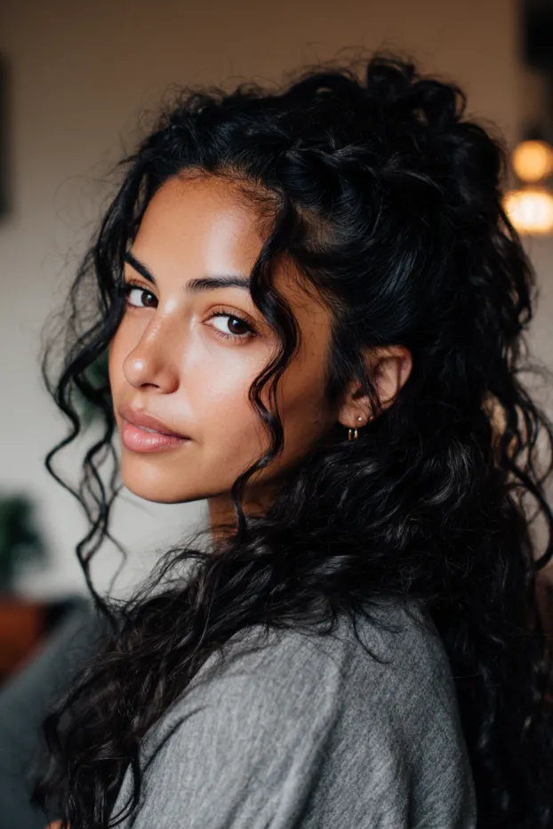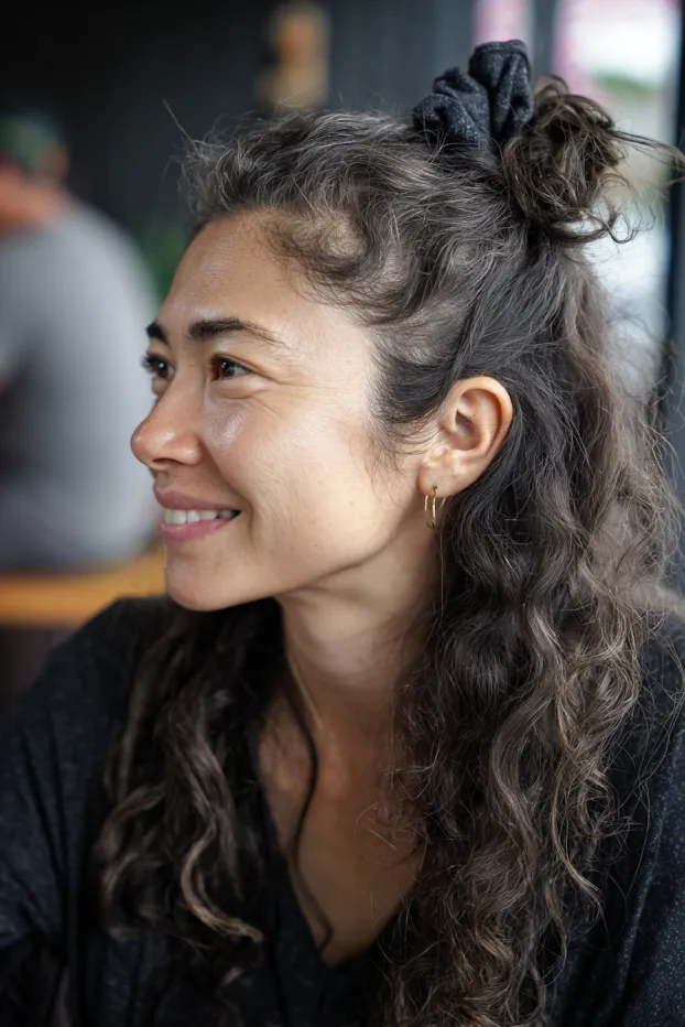 This look features long curly hair styled into a small half up bun secured with a soft scrunchie. The rest of the curls fall naturally with a slightly textured finish, giving it that cozy everyday vibe.