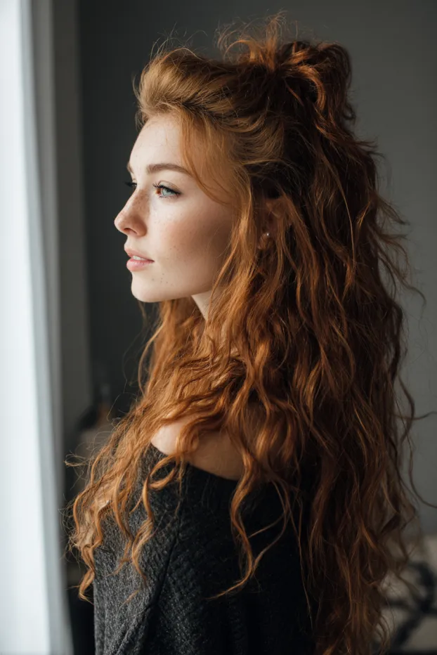 This look shows long, copper toned curly hair styled in a relaxed half up section with gentle lift at the top. The waves are soft and slightly tousled, with a warm, dimensional color that adds richness.
