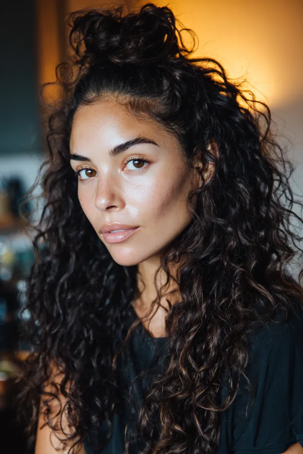 Messy Half Up Curly Top Knot