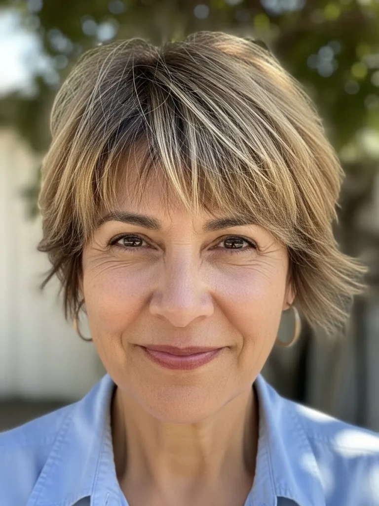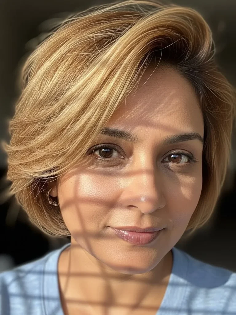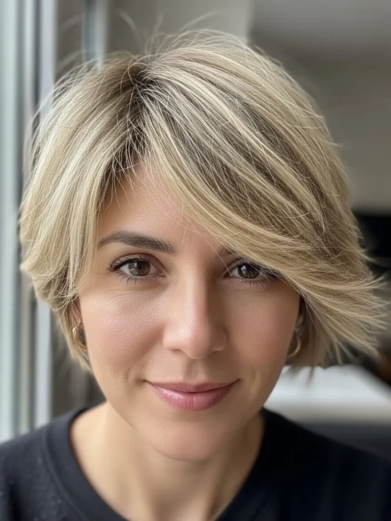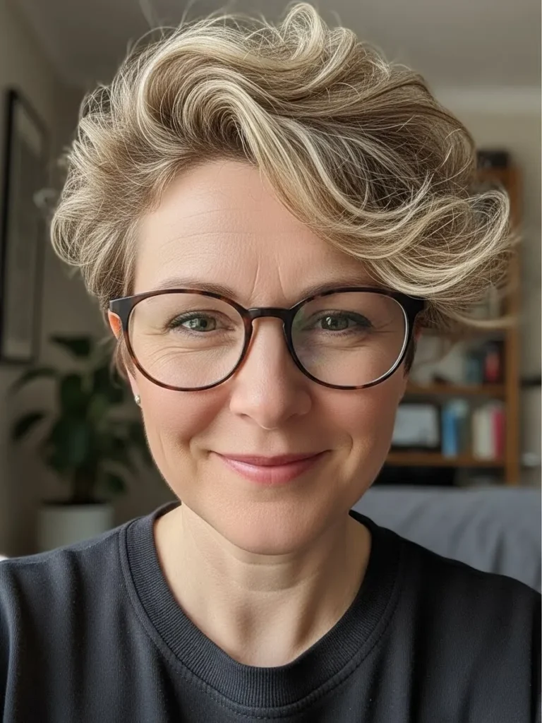 This pixie cut is styled with tousled layers and soft blonde highlights that create depth and dimension. The light, airy texture works well to create a more youthful look, with gentle waves and subtle volume at the crown. The natural light coming from the window enhances the highlights, making the hairstyle look fresh and vibrant.