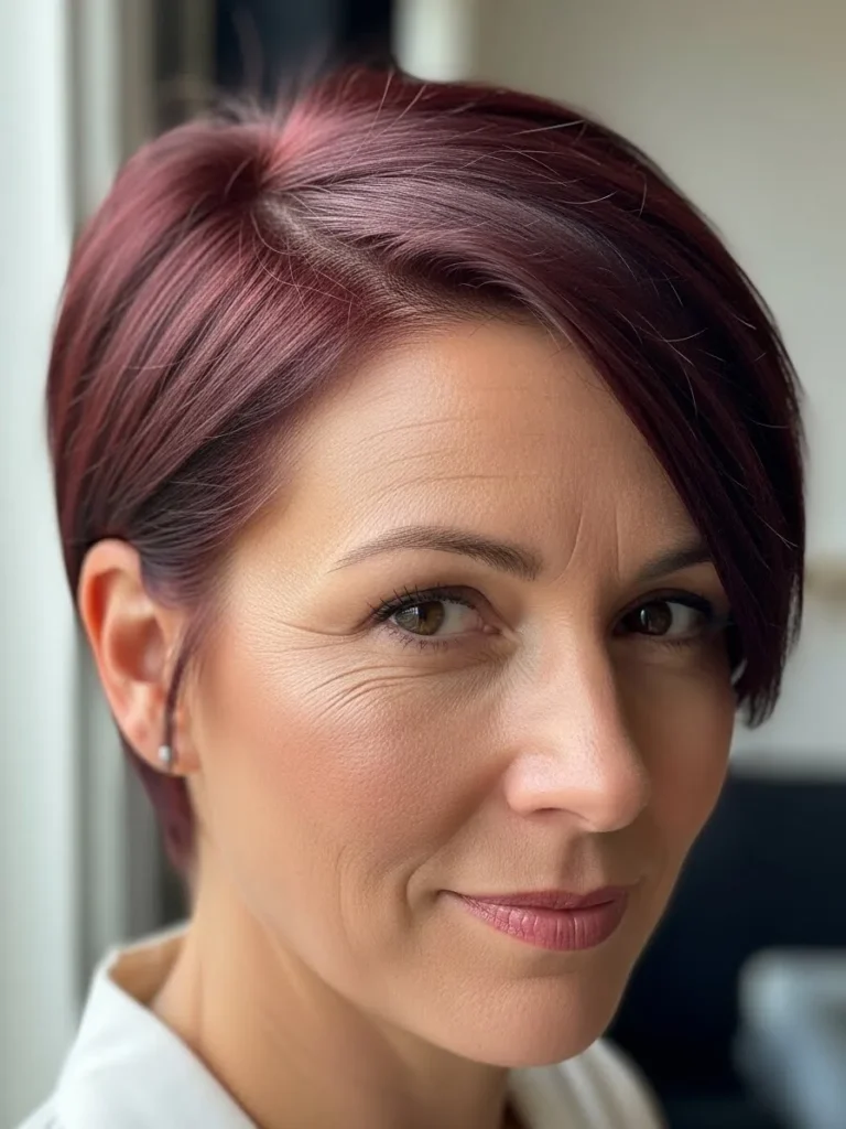 This pixie is an excellent choice for round faces, as the sleek lines along the sides define the face, while the volume at the crown adds height. The burgundy color gives the cut a sophisticated, edgy feel, making it perfect for anyone looking to add a touch of drama and style to their look.