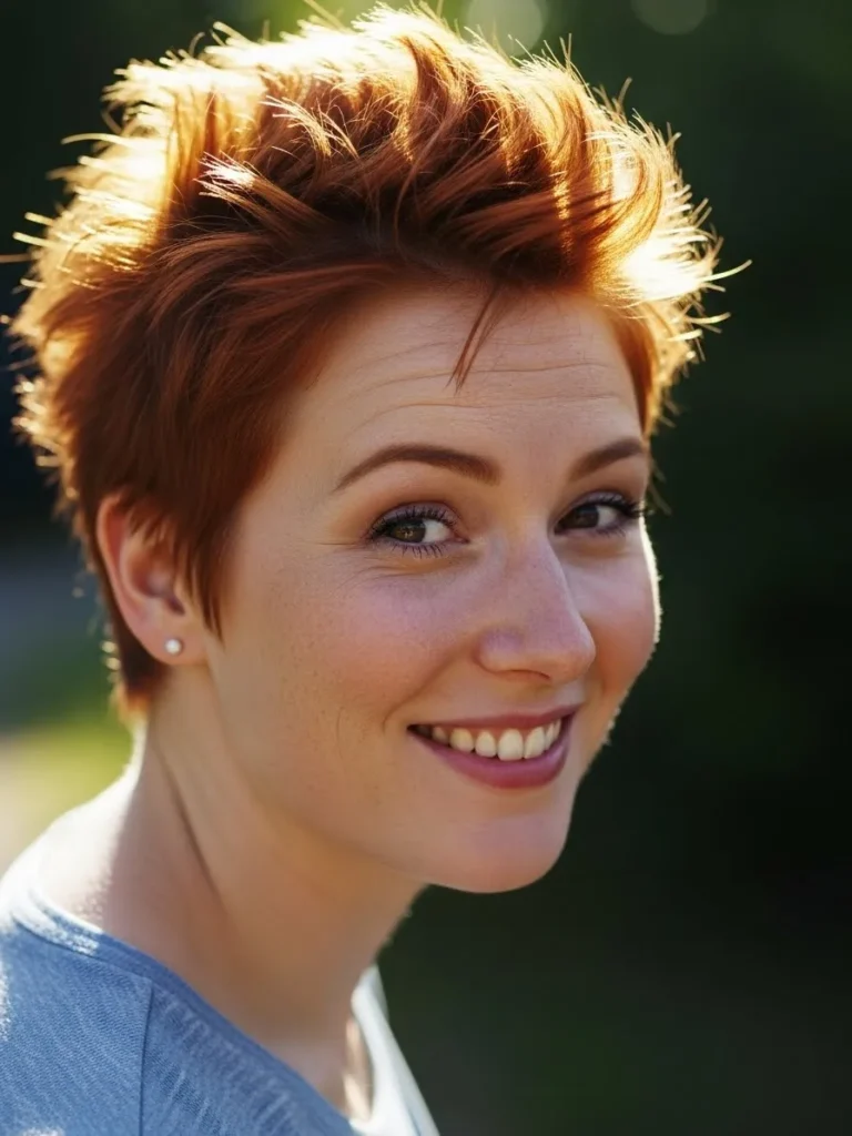 This pixie cut is fantastic if you want a hairstyle that gives you both volume and shape. The layers add height and create a balance that works wonders for round faces, while the rich red color makes a statement. It’s a perfect choice if you want something unique that still feels flattering and balanced.