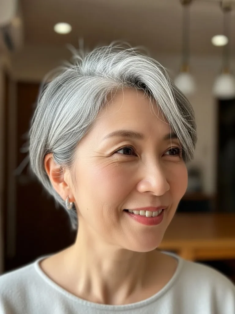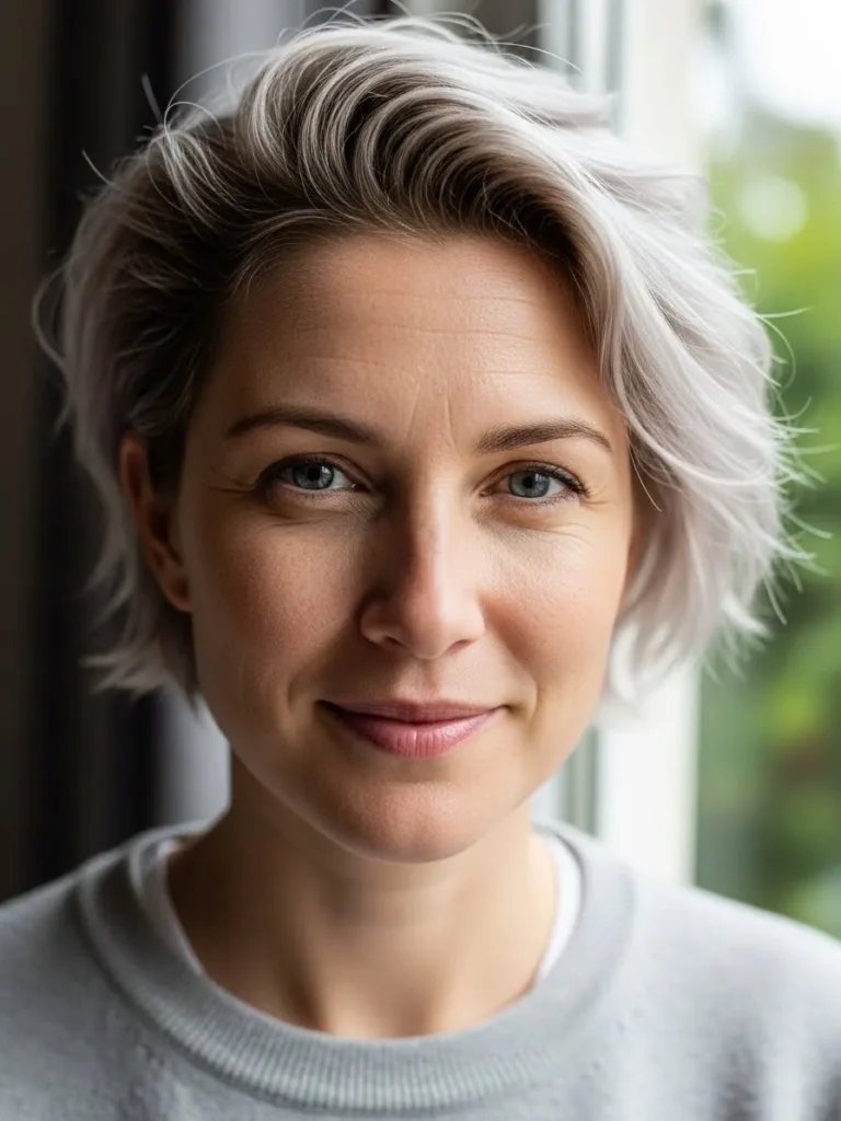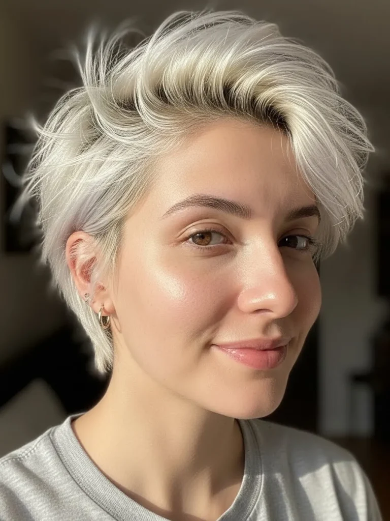 This pixie cut works beautifully for round faces, especially with the added volume at the crown. The soft layers elongate the face and give it a refined, elegant appearance. The silver-gray color adds a modern, sophisticated touch that feels both fresh and timeless.