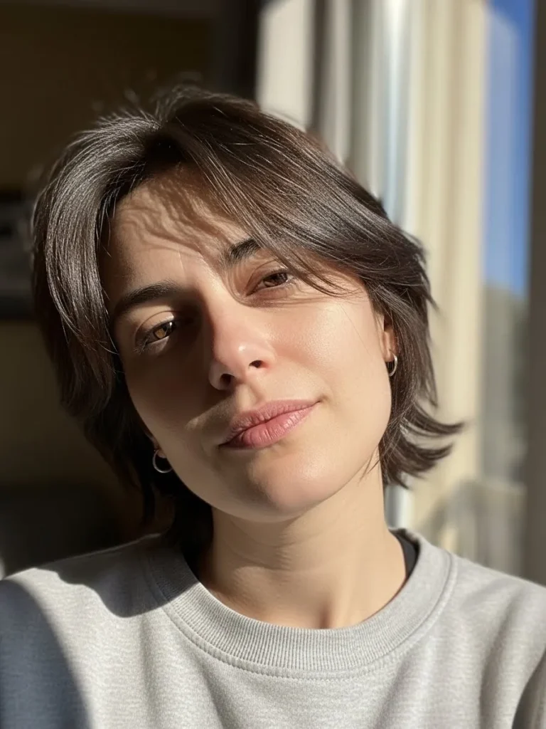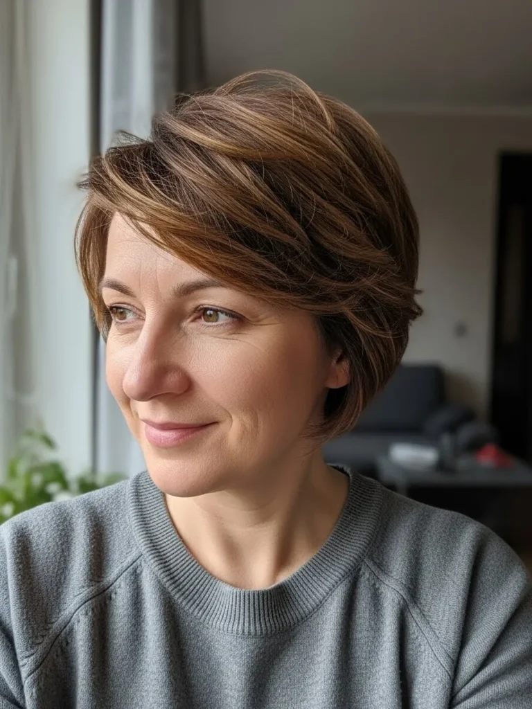 This relaxed pixie has soft layers that flow around the face, with gentle waves that add movement and texture. The color is a natural, warm brown with subtle sun-kissed highlights that catch the light. The hair is styled with a slightly tousled look, allowing for a more laid-back vibe. The natural lighting coming through the window highlights the hair’s texture and creates soft shadows on the face.