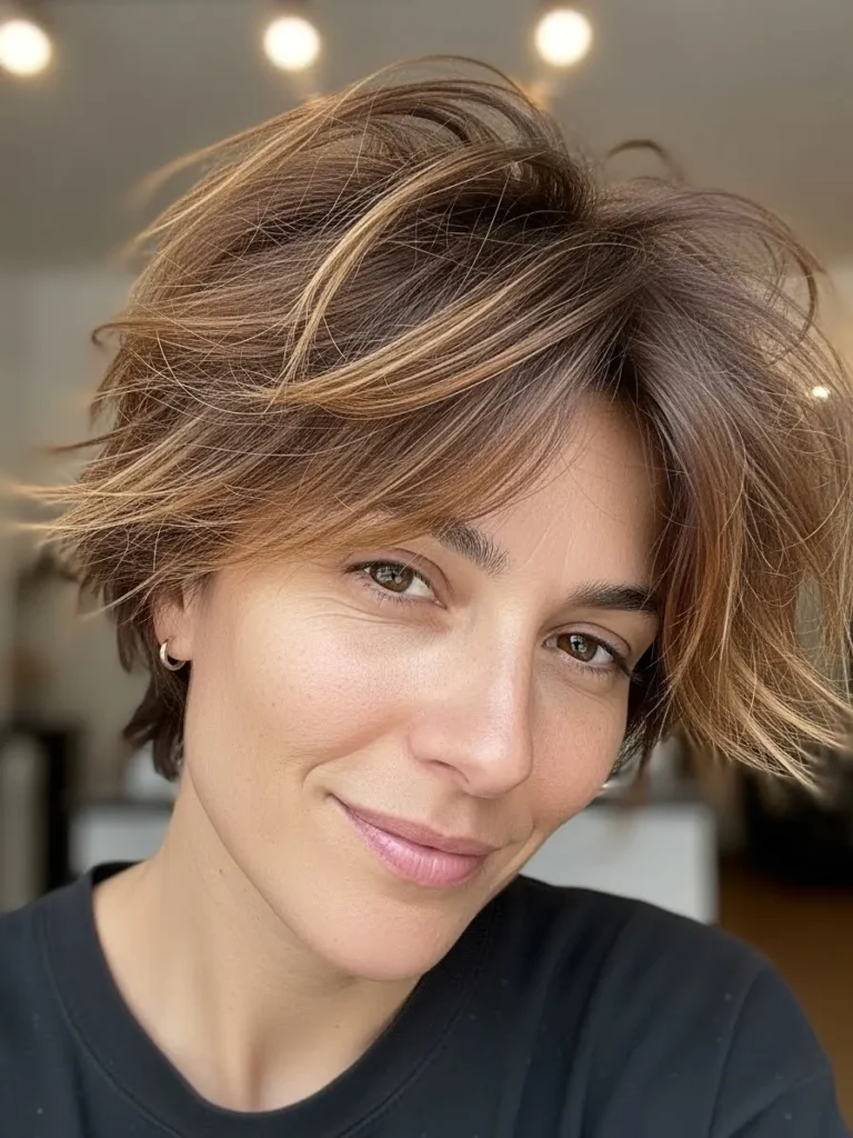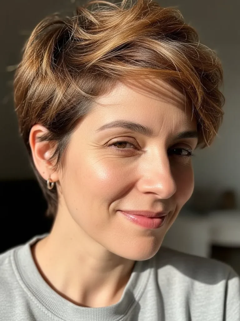 This fun pixie has tousled layers that give it an effortlessly chic vibe. The hair color is a warm brown with caramel highlights that add depth and dimension. The texture is light and airy, with pieces framing the face softly while the top remains slightly voluminous. Shot with soft indoor lighting, the photo has a relaxed, natural feel with visible flyaways and skin texture.