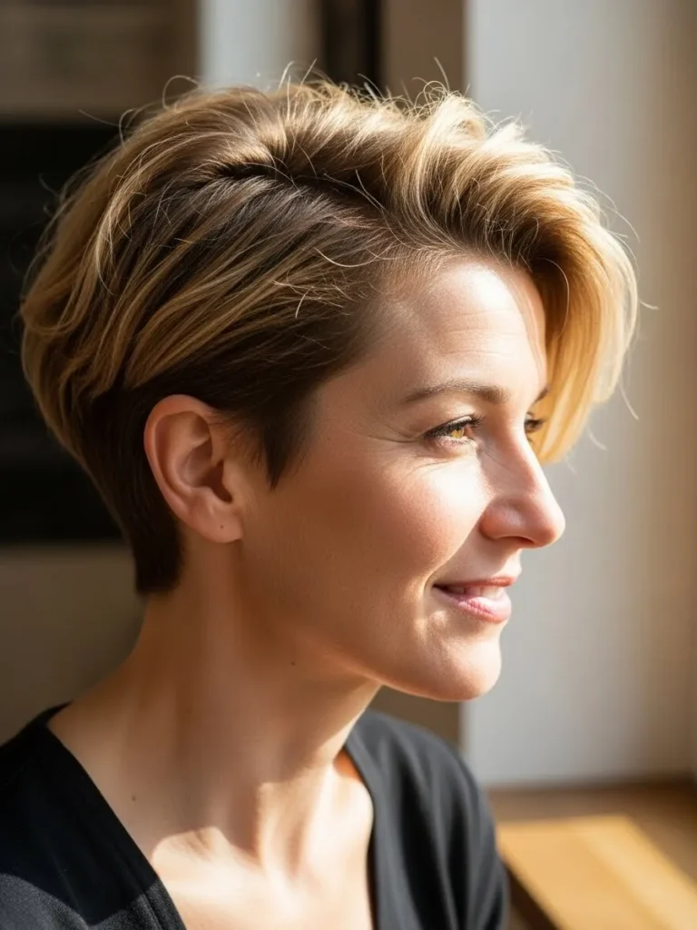 This pixie cut is sleek and stylish with volume at the top and subtle layers throughout. The color is a beautiful blend of warm blonde and golden highlights, catching the light and adding dimension to the hairstyle. The sides are short, while the top is swept to one side, creating an effortlessly chic and modern look. The natural light shining from the side gives the hairstyle a soft glow, highlighting the color and texture.