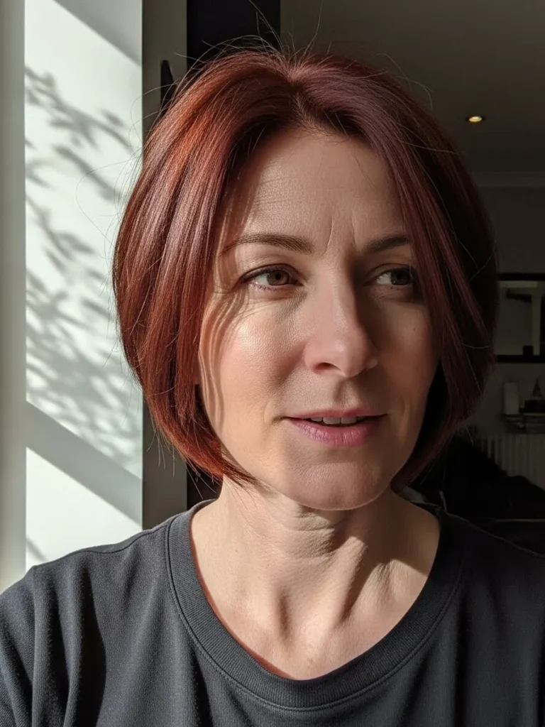 This chic burgundy pixie cut features sleek, sharp lines that frame the face perfectly. The color is a deep burgundy with rich, subtle undertones, adding a bold yet sophisticated touch. The cut is smooth with slightly tousled texture at the crown, making it both structured and playful. The soft natural light highlights the color’s depth, creating a radiant finish.