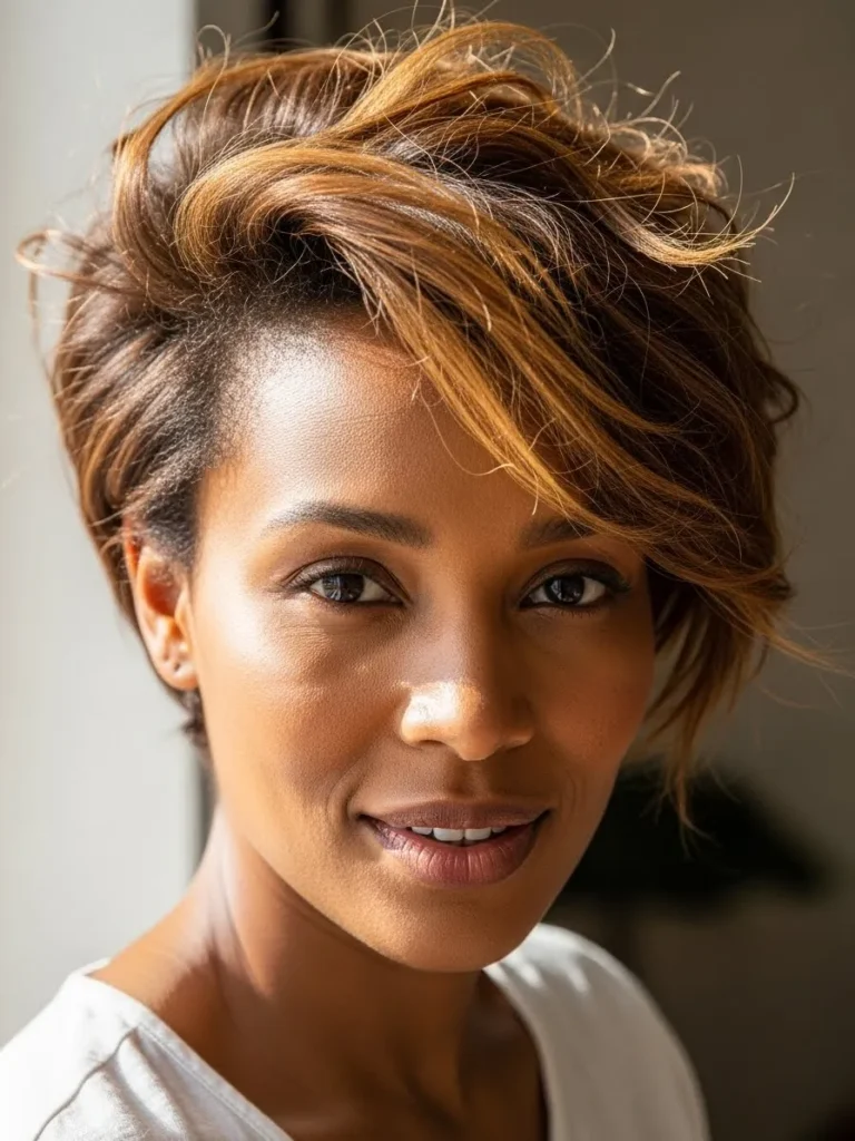 This pixie is perfect for round faces, as the volume at the top adds height, while the short, side-swept layers create an elongated effect. The warm highlights make the cut even more dynamic, while the sleek style keeps it polished and sophisticated. It’s the ideal balance between playful and refined!