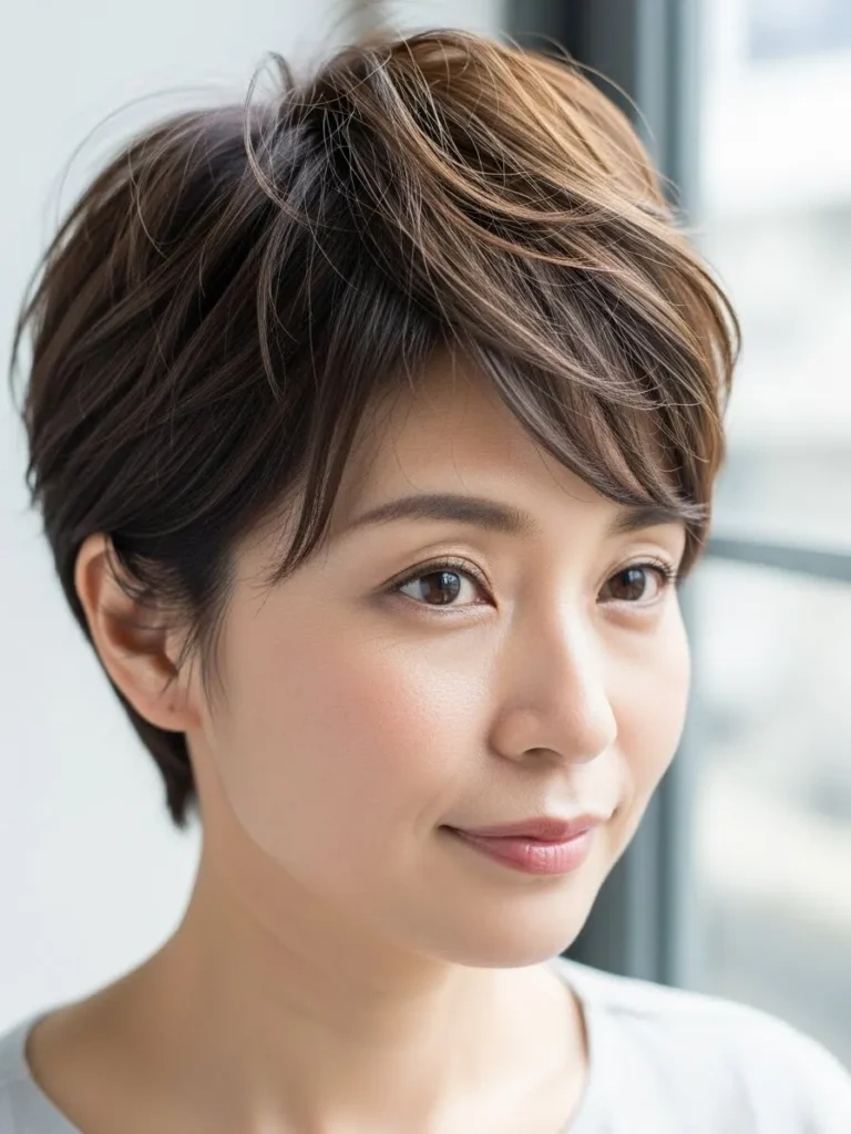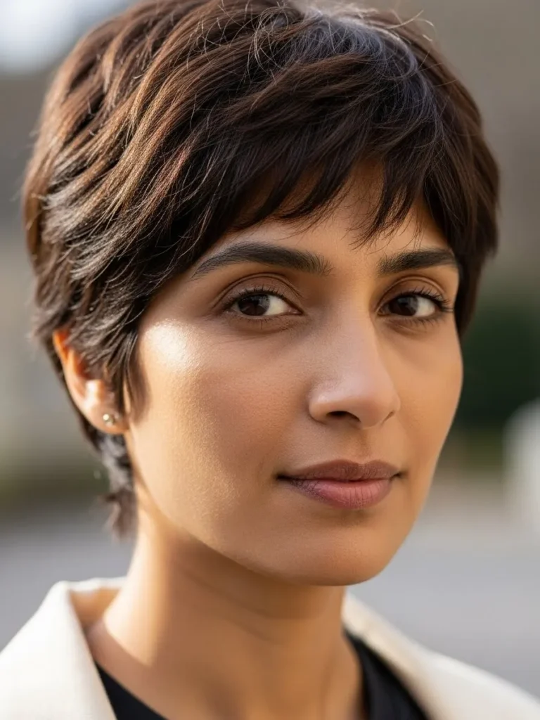 This pixie cut is all about texture and movement. The choppy ends and soft fringes around the forehead create a carefree, tousled look. The medium brown color with subtle highlights adds depth to the hairstyle, while the light layers around the face add softness.