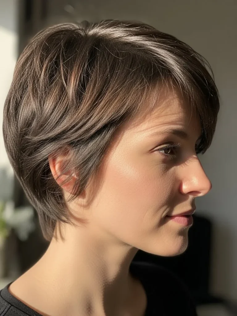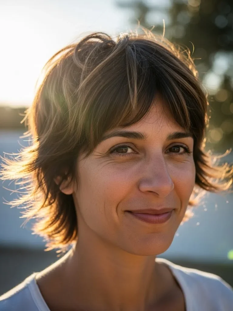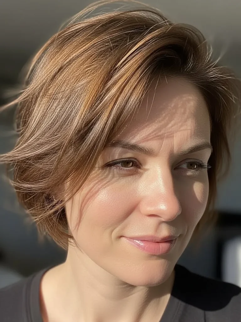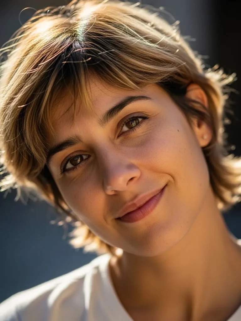 A short, layered pixie with gentle, sun-kissed highlights that catch the light just perfectly. The layers are soft and slightly tousled, creating a casual, laid-back look that feels fresh and youthful. The natural shine in the hair complements the soft texture and the choppy ends that add a bit of playfulness.