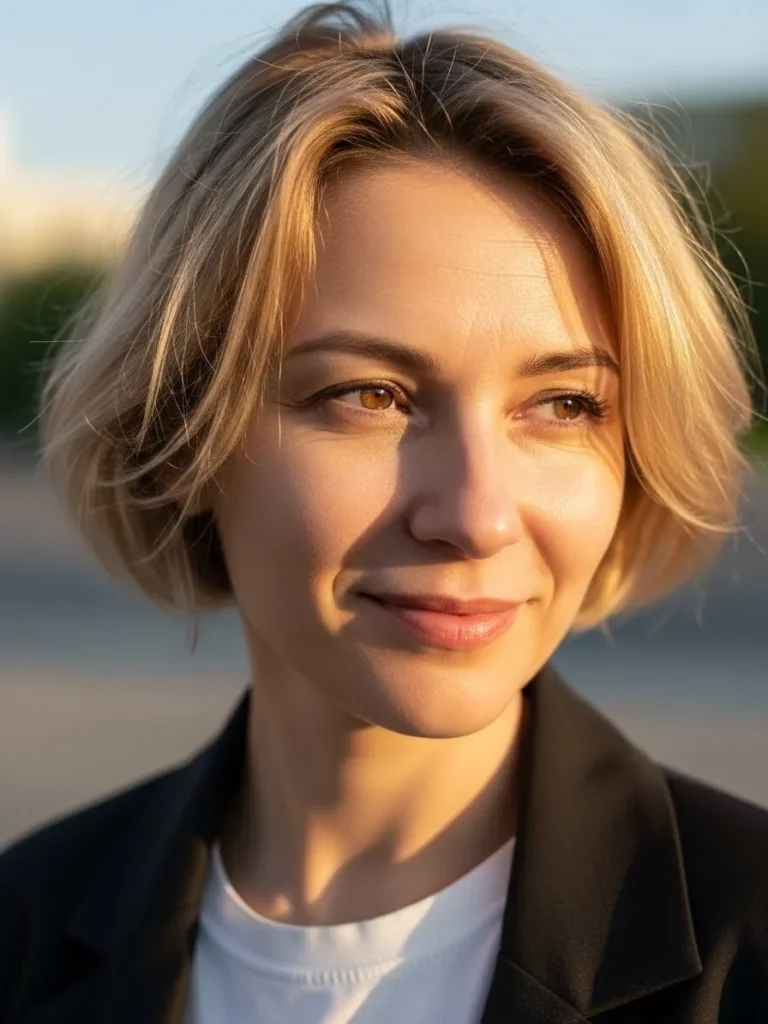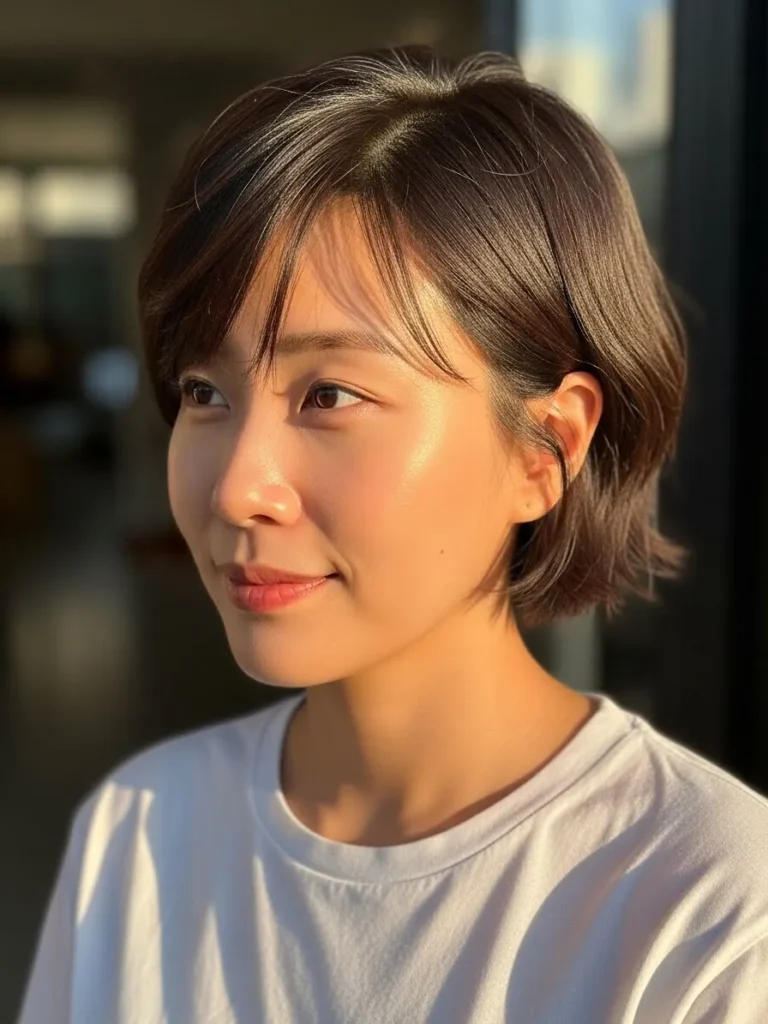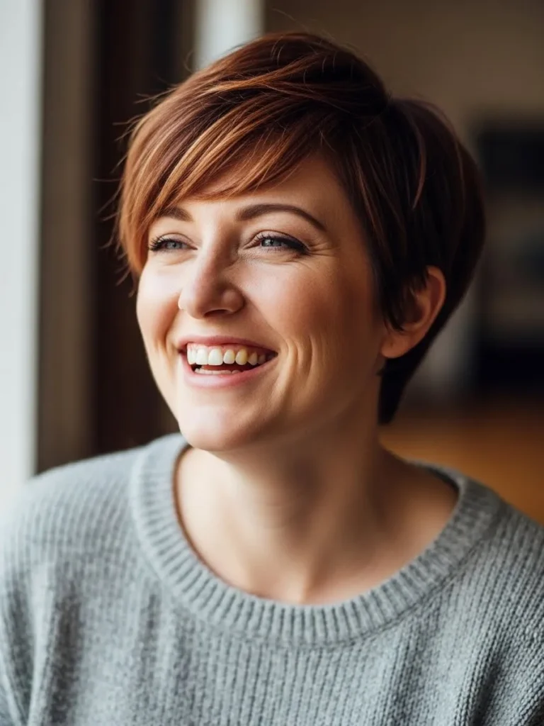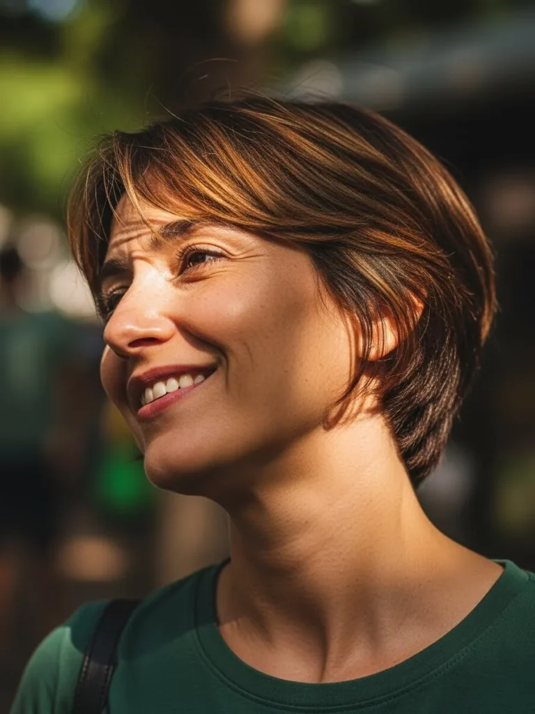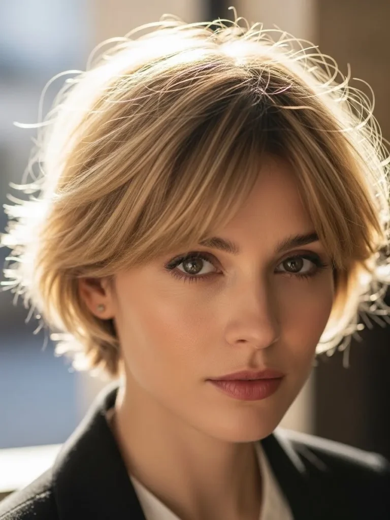 A short, layered pixie with gentle, sun-kissed highlights that catch the light just perfectly. The layers are soft and slightly tousled, creating a casual, laid-back look that feels fresh and youthful. The natural shine in the hair complements the soft texture and the choppy ends that add a bit of playfulness.