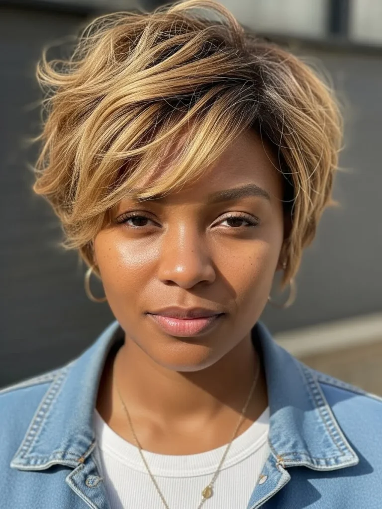 This pixie cut is full of personality, with tousled layers and soft bangs that frame the face beautifully. The warm blonde highlights add dimension to the hair, creating a sun-kissed effect that perfectly complements the light and airy texture of the cut. The choppy ends give the hairstyle a relaxed, effortless vibe.