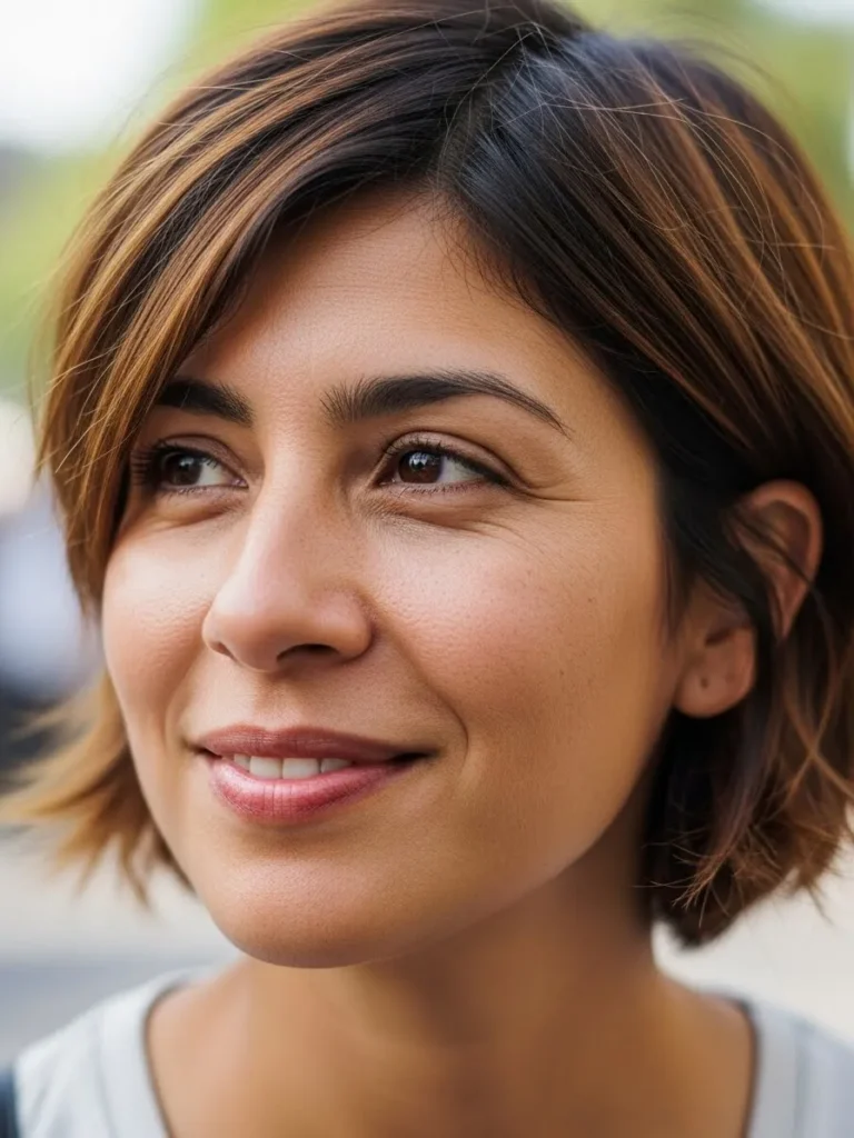This pixie cut offers the perfect balance of sleekness and texture. With soft layers and choppy ends, the cut has a lived-in feel that looks natural yet polished. The caramel and brown highlights throughout the hair bring out the layered cut, adding warmth and depth.
