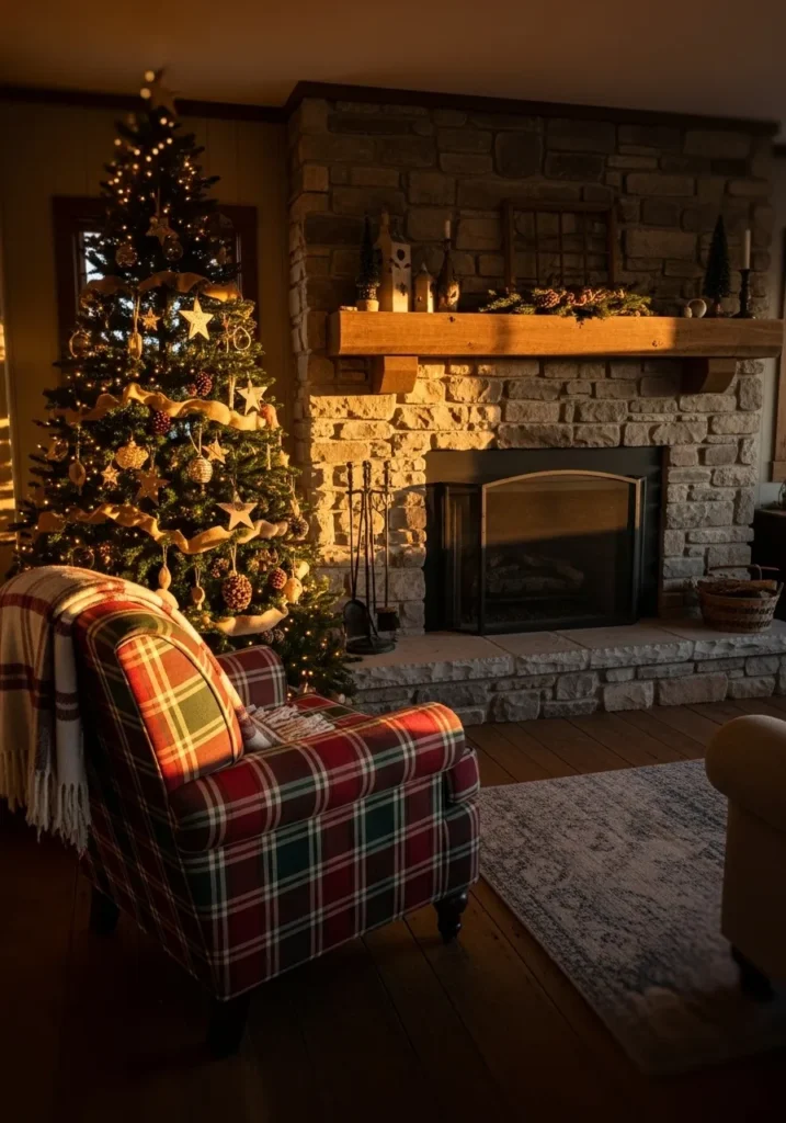 This rustic living room feels like the perfect mix of farmhouse warmth and holiday magic. A beautifully lit Christmas tree stands beside a stone fireplace, decorated with gold ribbon, wooden stars, and pinecones that bring the outdoors inside. The plaid armchair adds that charming country touch, and the soft glow from the string lights reflects gently on the natural stone and wood accents, giving the whole room that golden, late-afternoon glow that feels straight out of a holiday movie.