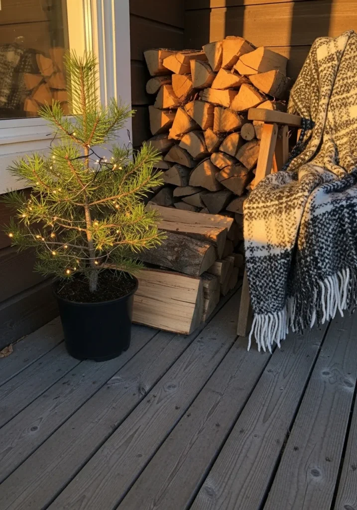 This rustic porch scene feels like the very definition of quiet, simple Christmas warmth. A small potted pine tree wrapped in soft fairy lights sits proudly beside a neat stack of freshly chopped firewood. The wooden deck and siding have that weathered farmhouse texture that instantly makes you imagine the scent of pine and a crackling fireplace nearby. A cozy plaid blanket draped over a wooden chair completes the picture, catching the last golden rays of the afternoon sun.