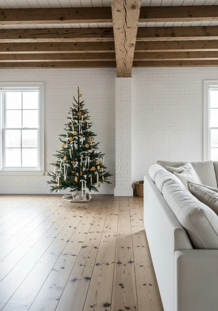 This beautiful living room captures everything I love about understated rustic elegance. The space features crisp white brick walls, wide wooden plank floors, and exposed timber beams that instantly add warmth and character. The Christmas tree is perfectly minimal, decorated with dried orange slices and simple white ribbons that bring a touch of homemade charm. The neutral-toned sofa tucked nearby keeps the look cozy and inviting, while natural light floods in through tall windows, creating that effortless farmhouse glow.