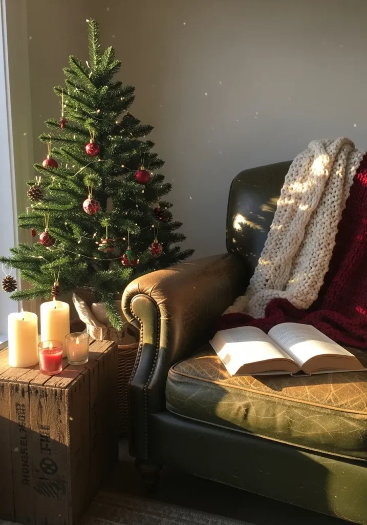 This cozy corner captures the heart of rustic simplicity with its warm, sunlit atmosphere. A small evergreen tree stands proudly beside a worn leather armchair, dressed with a few red ornaments, pinecones, and delicate fairy lights that twinkle softly in the afternoon light. The wooden crate used as a candle stand adds that charming farmhouse touch, especially with the mix of white and red candles casting a gentle glow. A chunky knit blanket draped over the chair and an open book invite anyone to pause, relax, and enjoy a quiet Christmas moment.