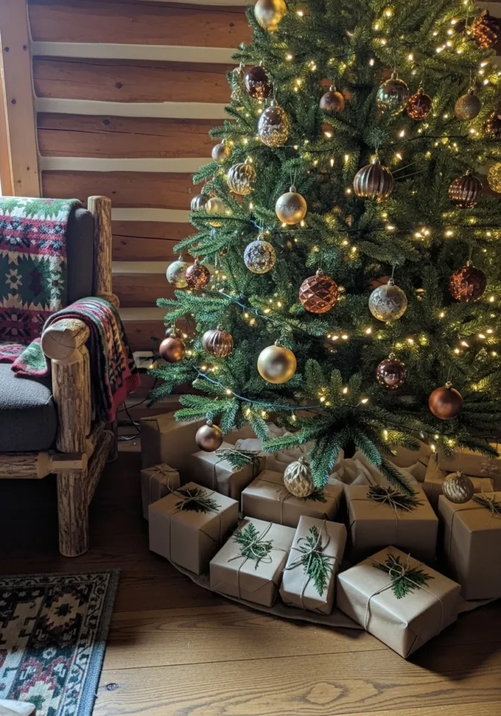 This rustic living room looks like the kind of place where Christmas magic naturally belongs. The log cabin walls and warm wooden floors make the perfect backdrop for a lush evergreen tree dressed in soft golden and bronze ornaments. Twinkling fairy lights cast a cozy glow across neatly wrapped gifts in brown paper and twine, each topped with a sprig of evergreen for that handmade touch. A chunky wooden armchair with a festive patterned throw adds just the right amount of texture and warmth, tying the whole scene together in perfect farmhouse harmony.