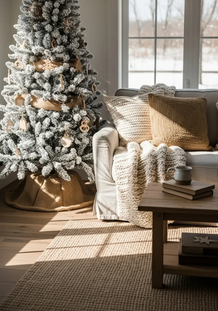 This beautiful farmhouse corner feels like it was made for slow winter mornings. The flocked Christmas tree, dusted in soft snow-like texture, is decorated with simple wooden ornaments and wrapped in a wide burlap ribbon that ties the whole natural theme together. The sofa nearby, layered with chunky knit throws and textured pillows in warm beige and cream tones, invites you to snuggle up with a cup of cocoa while the sunlight streams through the frosted window. Every element—from the jute rug to the wooden coffee table stacked with books—adds to the rustic, lived-in charm.