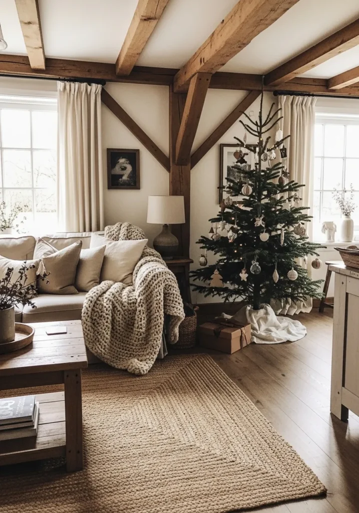 This beautiful farmhouse living room feels like a warm hug on a chilly December morning. The exposed wooden beams and soft neutral palette set such a calm and cozy mood. A simple evergreen tree dressed with wooden ornaments and white baubles fits perfectly beside the linen-draped windows. The chunky knit throw on the couch, woven rug, and rustic wooden coffee table add so much texture and depth, creating a space that feels both lived-in and lovingly curated.