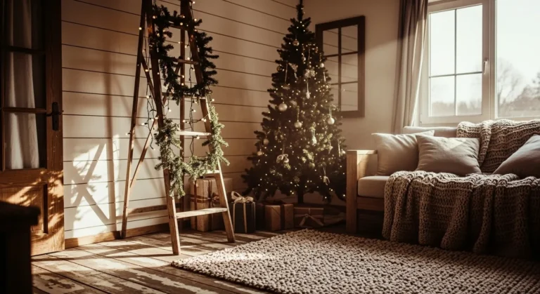 I love how this space doesn’t try too hard yet still feels incredibly festive. The blend of natural wood, cozy textiles, and twinkling lights makes it feel both rustic and magical. There’s something about that plaid blanket ladder that makes me want to curl up with one and watch the snowfall outside. It’s charming, imperfect in the best way, and so effortlessly full of heart.